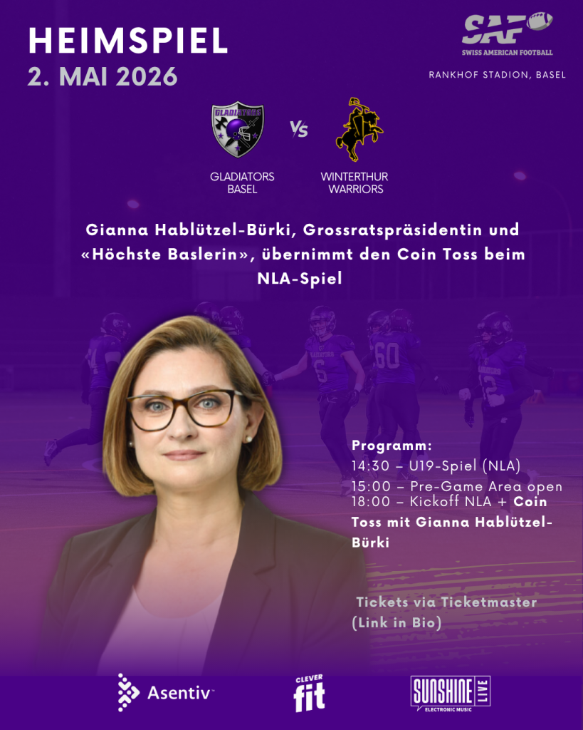 - 18:00 Uhr: Kickoff der Basel Gladiators – inklusive Coin Toss mit Gianna Hablützel-Bürki