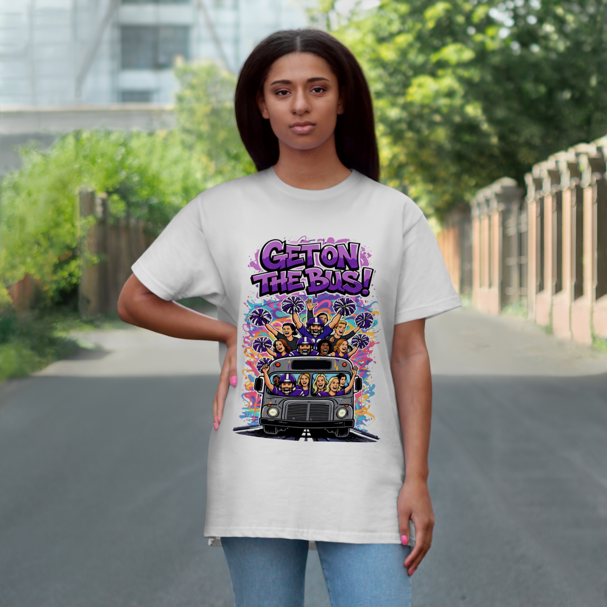 Dieses lässige Single-Jersey-T-Shirt in Regular-Fit rückt eine auffällige, verspielte Szene in den Mittelpunkt – einen bunten Partybus voller fröhlicher Figuren unter der markanten Überschrift „GET ON THE BUS!“. Es wirkt wie ein sonniger Roadtrip, eingefangen in Tinte: Palmen-Silhouetten, Konfettiregen und lächelnde Gesichter auf leichtem, atmungsaktivem Stoff. Trage es, um unbeschwerte Energie auszustrahlen, Gespräche anzuregen oder die Erinnerung an ein gemeinsames Abenteuer festzuhalten. Der Aufdruck prangt selbstbewusst auf der Brust und verleiht dem Shirt einen grafischen, ausdrucksstarken Look, der perfekt zu Festivalbesuchern, Gruppenfotos oder entspannten Wochenendtreffen passt.